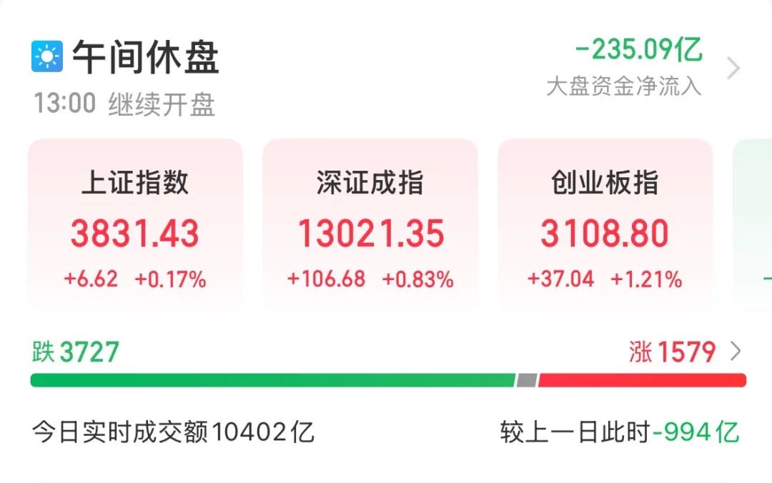 12月17日早盘,A股三大指数集体反弹,创业板指领涨。截至午间收盘,上证指数报3831.43点,涨0.17%;深证成指、创业板指分别涨0.83%、1.21%。沪深北三市半日成交10402亿元。AI主线再度活跃,新易盛(300502)、中际旭创(300308)成交额均超百亿元,新易盛(300502)半日成交131亿元居所有个股首位。